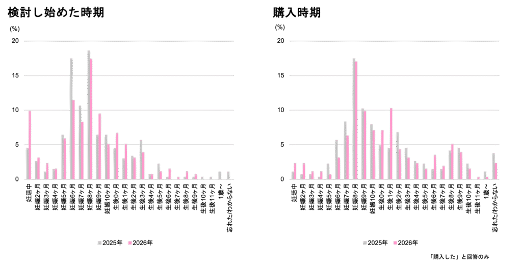 検討開始時期は「出産前」が約75%、購入は「妊娠後期〜生後1ヶ月」が約50%