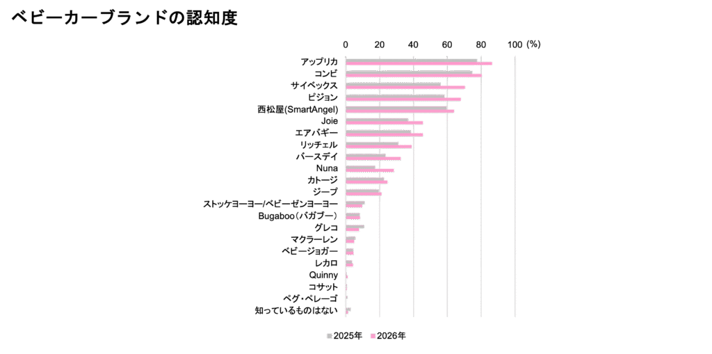 ベビーカーのブランド認知度では、「アップリカ」「コンビ」が8割を超え、依然として高い水準を維持している。特筆すべきは「サイベックス」の躍進であり、約56%(2025年)から約70%(2026年)へと大幅に増加した。