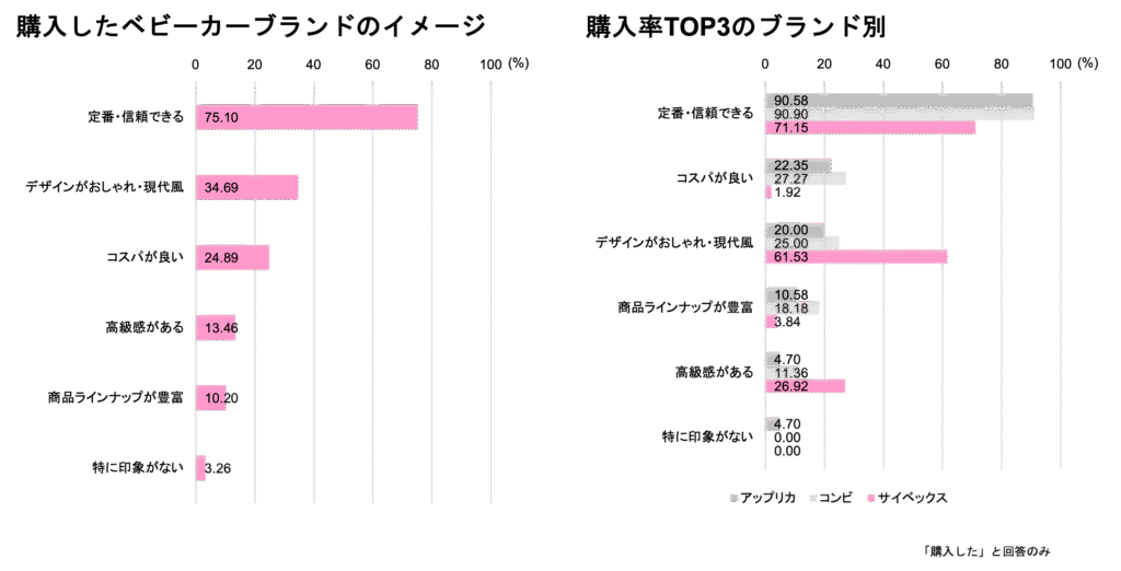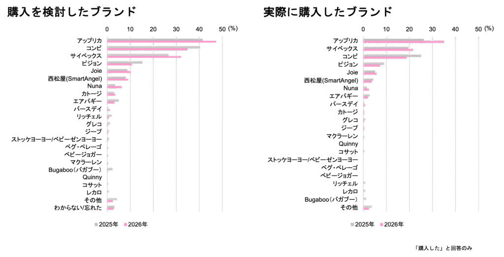 実際の購入ブランドでは、こうした変化がより鮮明に表れている。「アップリカ」は約26%(2025年)から約35%(2026年)へとシェアを拡大した。また、「サイベックス」が約22%(2026年)で2位に浮上し、前年2位の「コンビ」は約19%(前年比約6%減)となり3位へと後退した。
