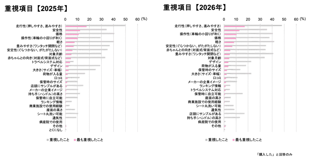 ベビーカー選定における重視項目では、2025年・2026年ともに「走行性」が最多となった。また、「操作性(車輪の小回りが利く)」が約29%(2025年)から約41%(2026年)へと大幅に増加し、「価格」を上回った。操作性のニーズが高まっている背景には、ベビーカーを単なる移動手段ではなく、育児時の負担を軽減するためのツールとして捉える意識の変化があると考えられる。狭い道や公共交通機関での利用など、日常的な使いやすさがより重視されているといえる。