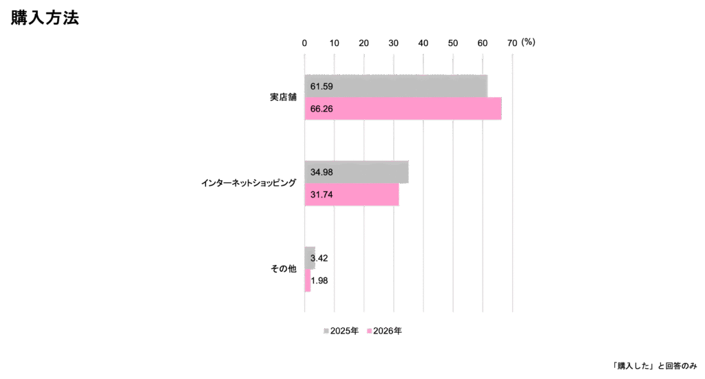 ベビーカーの購入方法について、2026年は「実店舗」での購入が約66%を占め、2025年から約5%増加した。一方で、「インターネットショッピング」は約32%と、前年から約3%減少している。