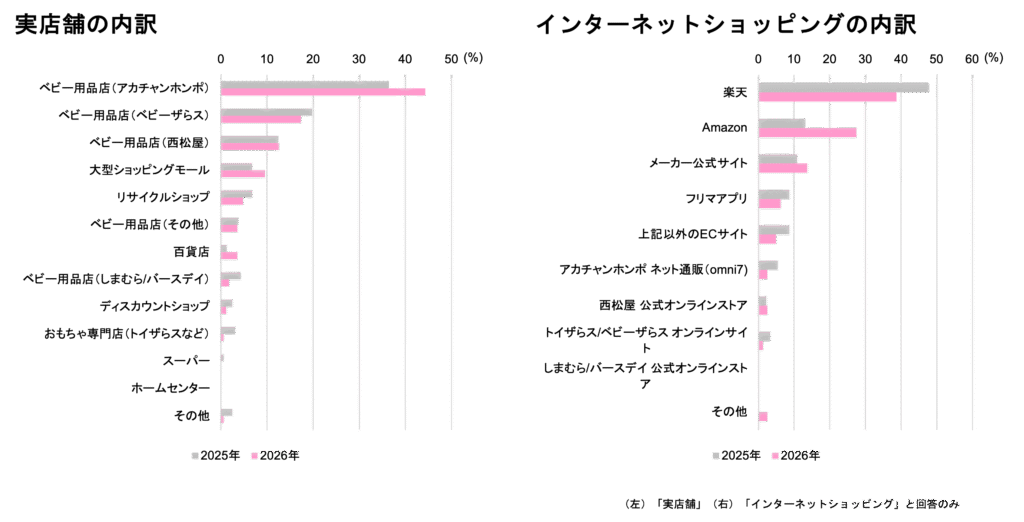 実店舗の内訳を見ると、「ベビー用品店(アカチャンホンポ)」が約44%(前年比約8%増)で最多となり、2位の「ベビー用品店(ベビーザらス)」の約17%を大きく引き離している。インターネットショッピングでは、「楽天」が約39%で首位を維持しているものの、前年から約9%減少した。一方、「Amazon」は約28%と、2025年から約14%超の大幅な伸びを記録している。