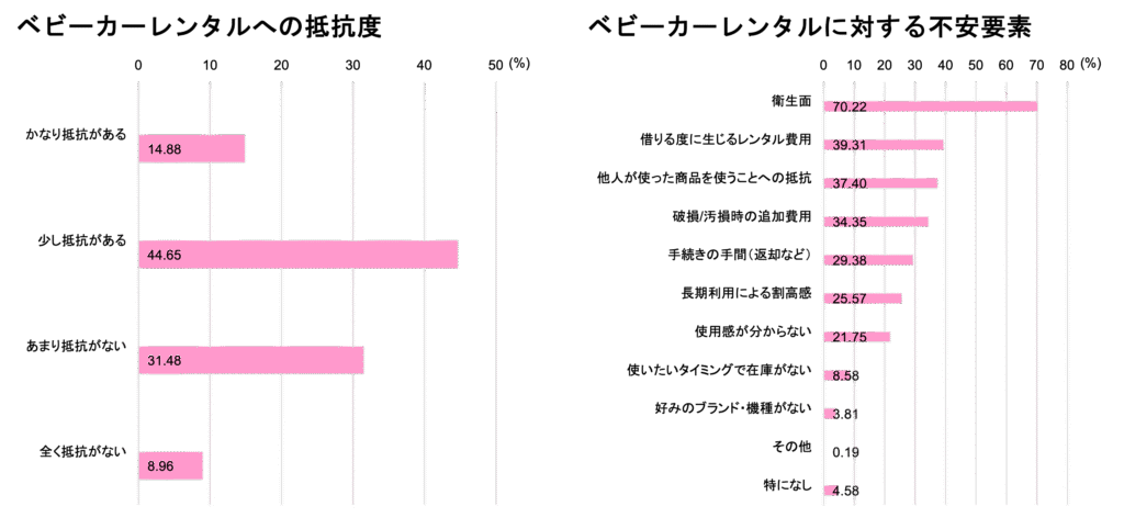 ベビーカーのレンタル利用について、「抵抗がある」と回答した割合は約60%にのぼり(かなり抵抗がある:約15%、少し抵抗がある:約45%)、過半数の子育て世帯がレンタル利用に対して消極的であることが示された。