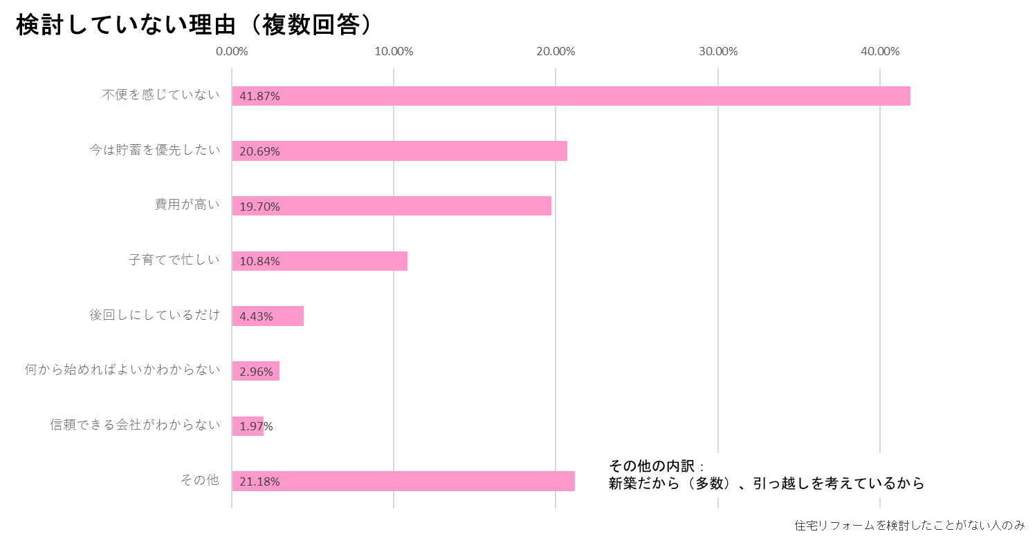 住宅リフォームの検討状況については、「すでに実施した」(11.86%)を含め、検討経験がある層は3割弱であった。検討していない理由としては、「不便を感じていない」(41.87%)が最も多く、次いで「今は貯蓄を優先したい」(20.69%)が続いた。