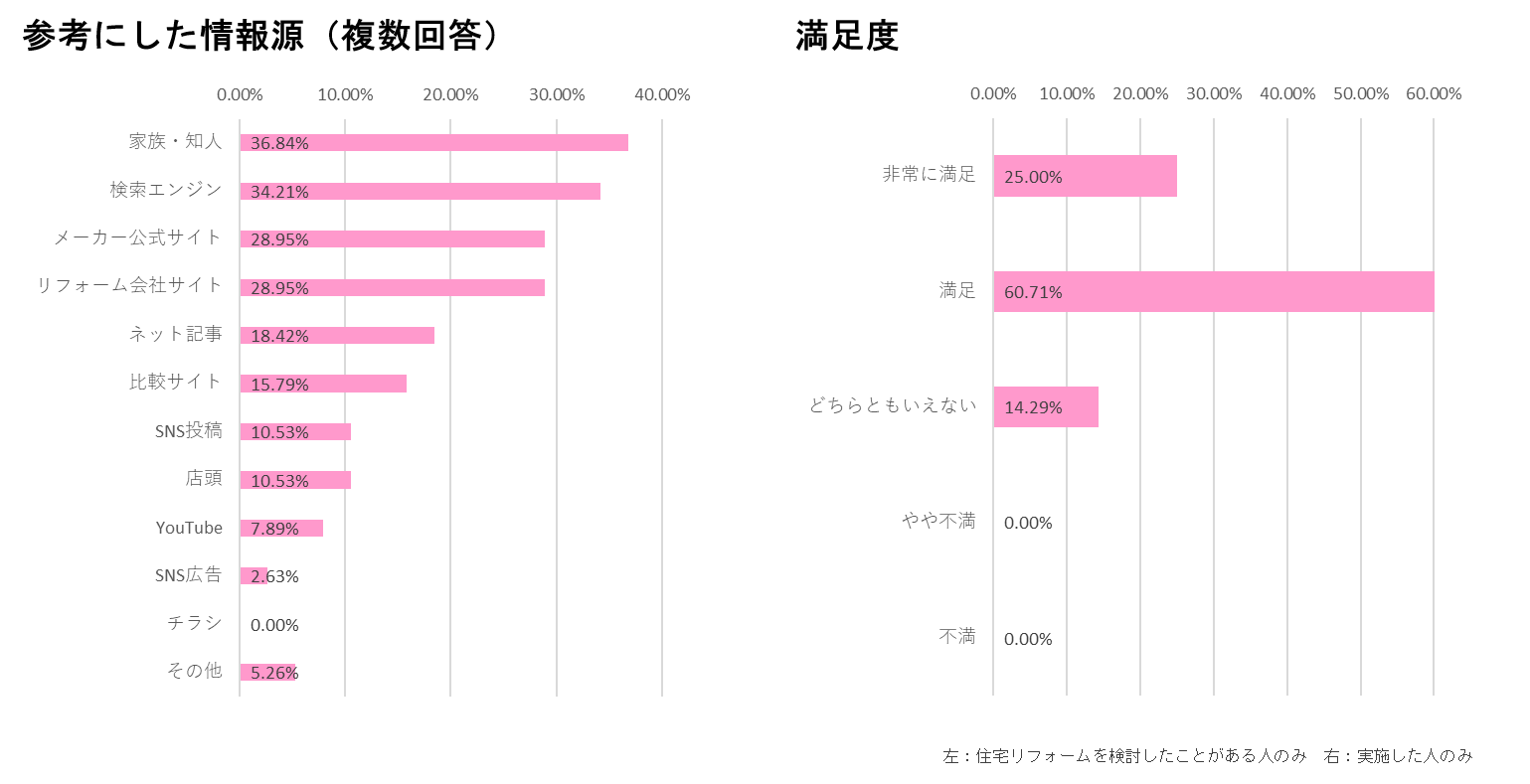リフォーム検討時の情報源としては、「家族・知人」(36.84%)が最も多く、次いで「検索エンジン」(34.21%)となった。身近な人からの情報と、インターネットでの能動的な情報収集の両方が活用されている様子がうかがえる。