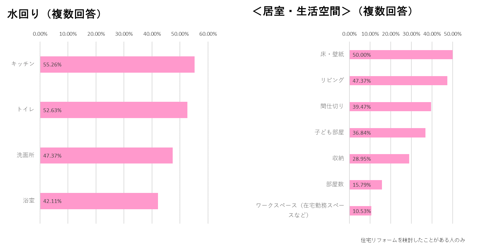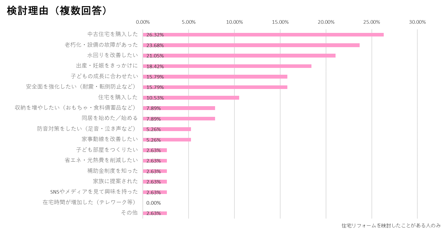 リフォームを検討した理由として最も多かったのは「中古住宅の購入」(26.32%)で、「老朽化」(23.68%)、「水回りの改善」(21.05%)が続いた。また、「妊娠・出産」(18.42%)や「子どもの成長」(15.79%)といった、子育て世帯特有のライフイベントがきっかけとなったいう回答も一定数集まった。
