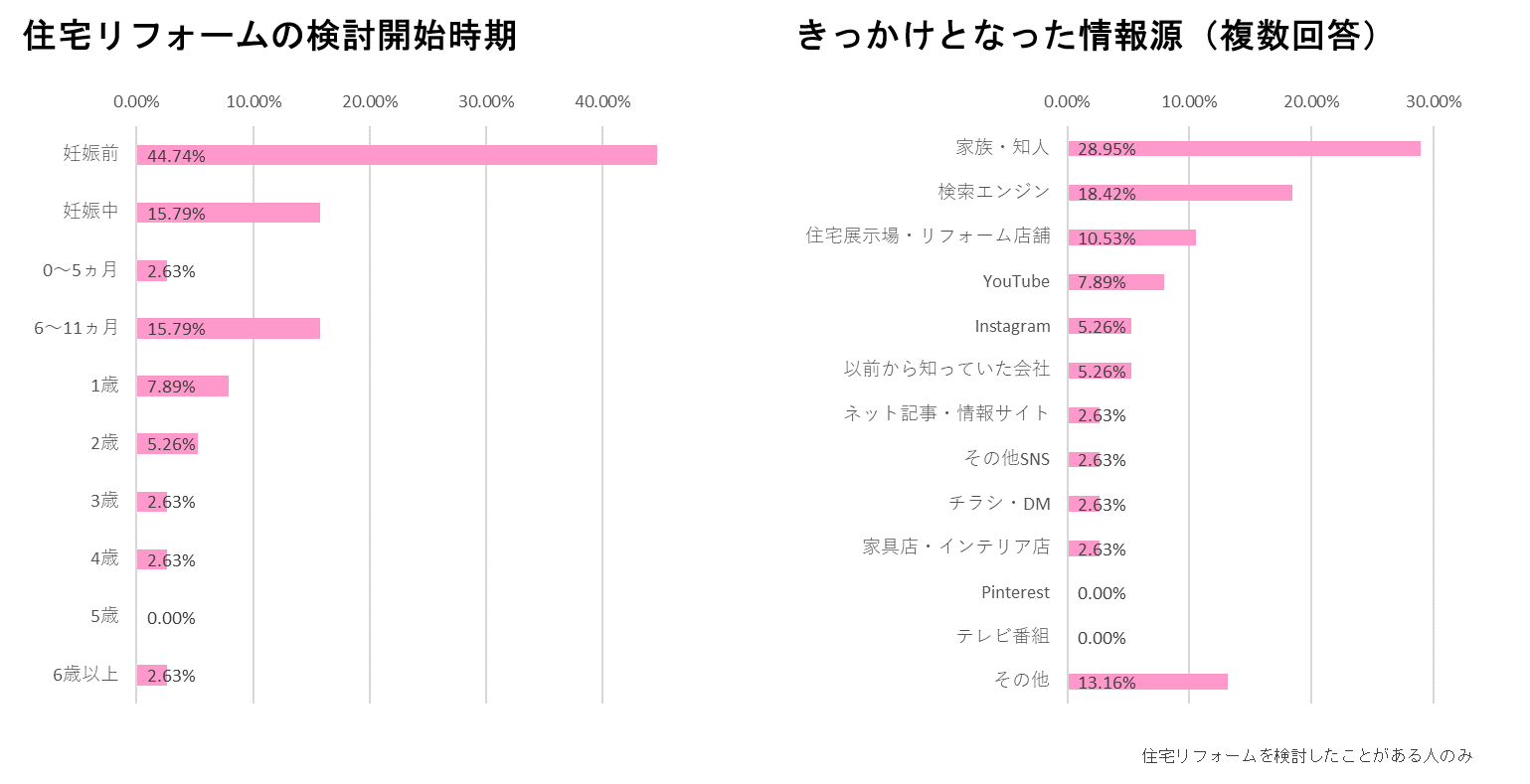 リフォームの検討開始時期は、「妊娠前」が44.74%で最も多かった。一方で、「妊娠中」と「0〜11カ月(0歳)」を合わせると約3割となっており、妊娠・出産前後が住環境の見直しを考えるきっかけのひとつになっていることがうかがえる。