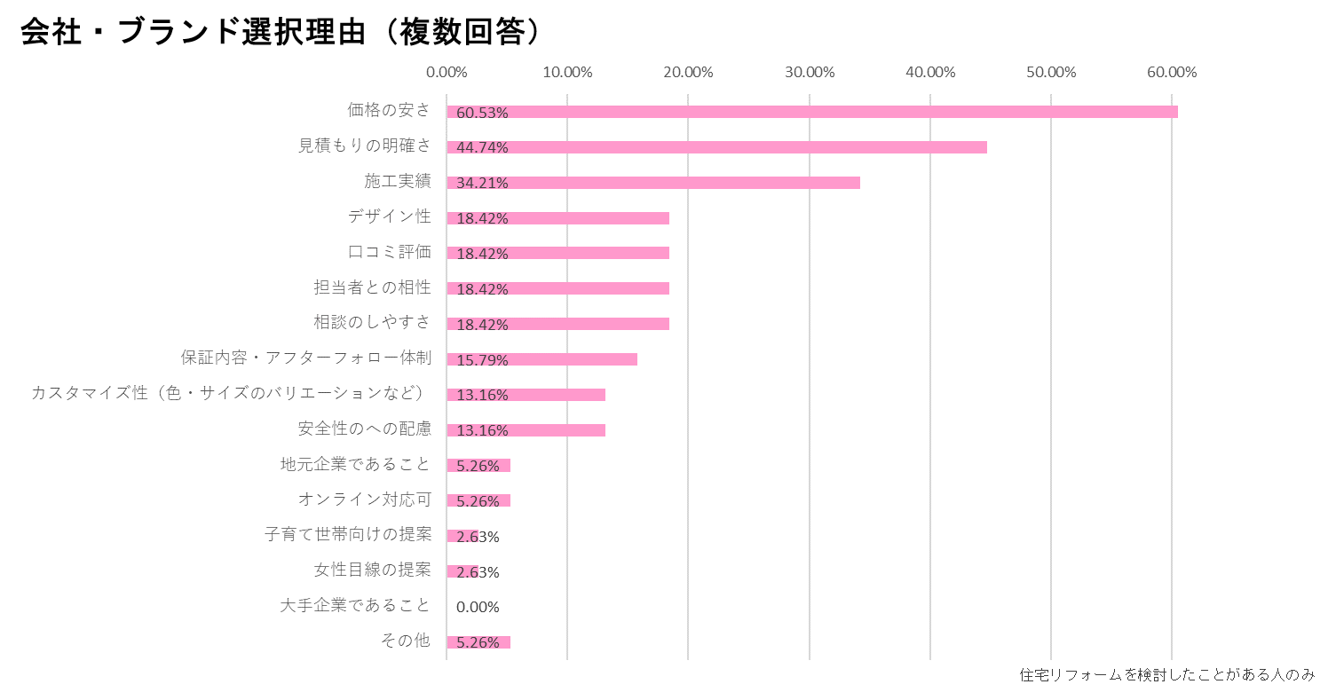 施行会社選択時の重視点では、「価格の安さ」(60.53%)が最も高かったが、「見積もりの明確さ」(44.74%)、「施工実績」(34.21%)も上位に入った。決して安くはない買い物になることから、価格のわかりやすさや施工への安心感も重要な判断材料になっていると考えられる。