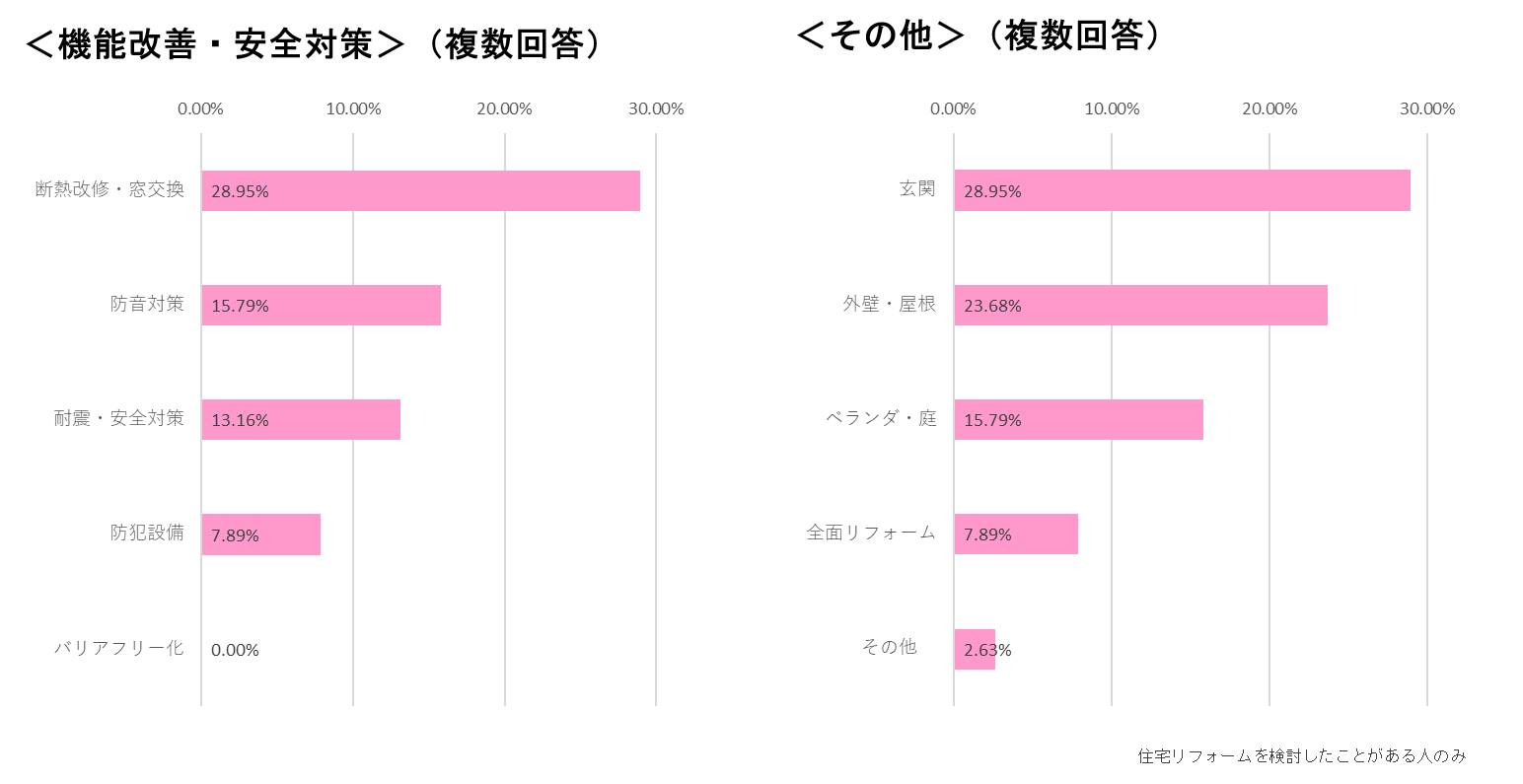 具体的に検討されたリフォーム内容を見ると、水回りでは「キッチン」(55.26%)、「トイレ」(52.63%)が高く、居室では「床・壁紙」(50.00%)、「リビング」(47.37%)への関心が高かった。さらに、「断熱改善・窓交換」(28.95%)や「玄関」(28.95%)など、快適性や安全性に関わる項目にも一定のニーズが見られた。