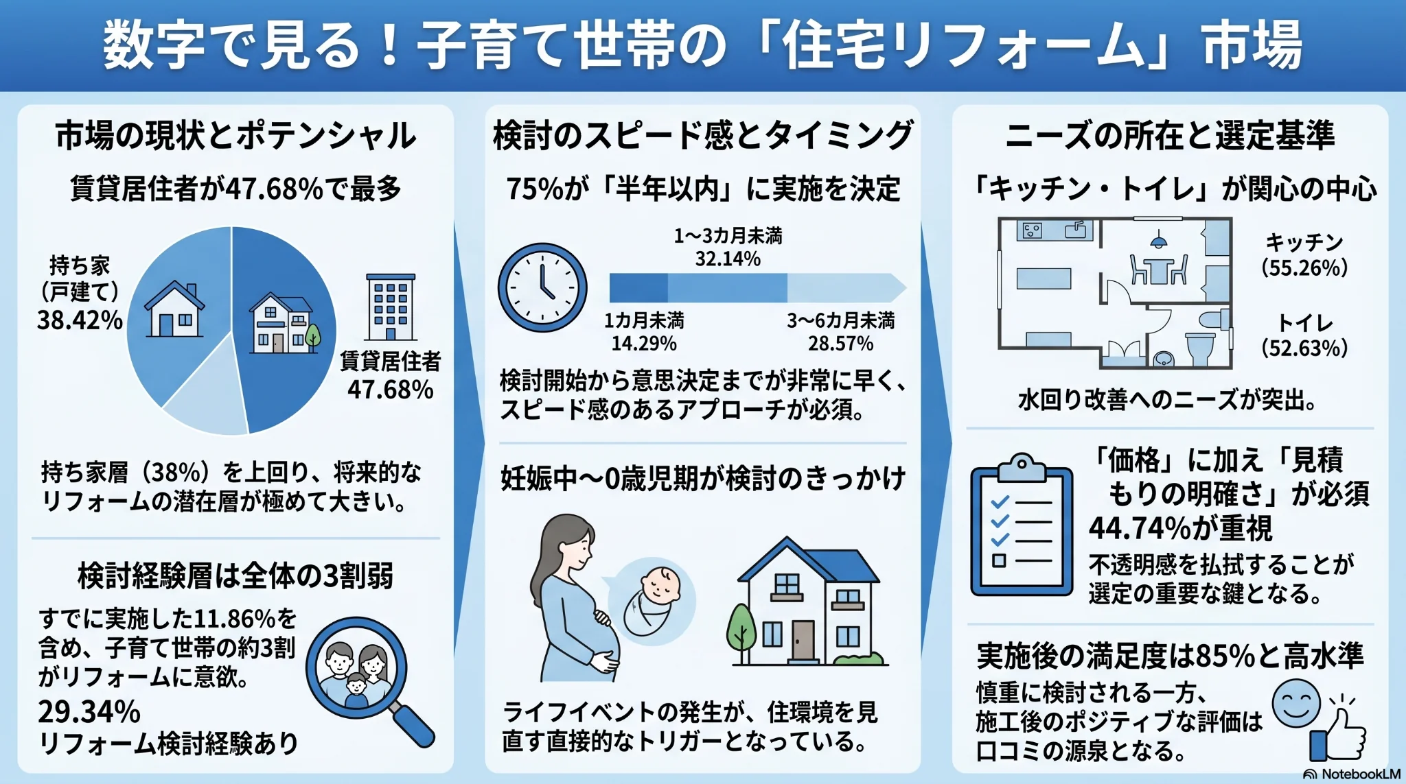 今回の調査から、子育て世帯における住宅リフォームは、妊娠・出産や子どもの成長、中古住宅の購入といったライフイベントをきっかけに検討されやすいことがわかった。また、検討が具体化した層では半年以内に実施に至るケースが多く、水回りや内装など、日々の暮らしや家事動線に関わる部分への関心が高い傾向が見られた。情報収集では、家族・知人からの口コミと検索エンジンの両方が活用されており、会社選択においては価格に加えて、見積もりの明確さや施工実績も重視されていた。こうした結果から、子育て世帯向けの住宅リフォーム訴求では、生活課題に寄り添った提案と、費用面・品質面での納得感を得られる情報設計が重要であると考えられる。